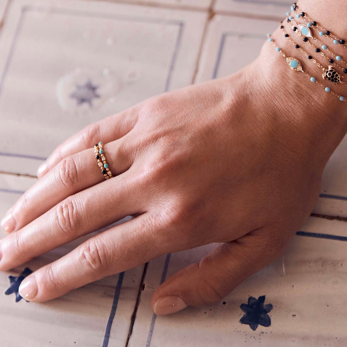 • Photo de la main d’une femme portant deux bagues Gigi Clozeau de couleur turquoise et noire.