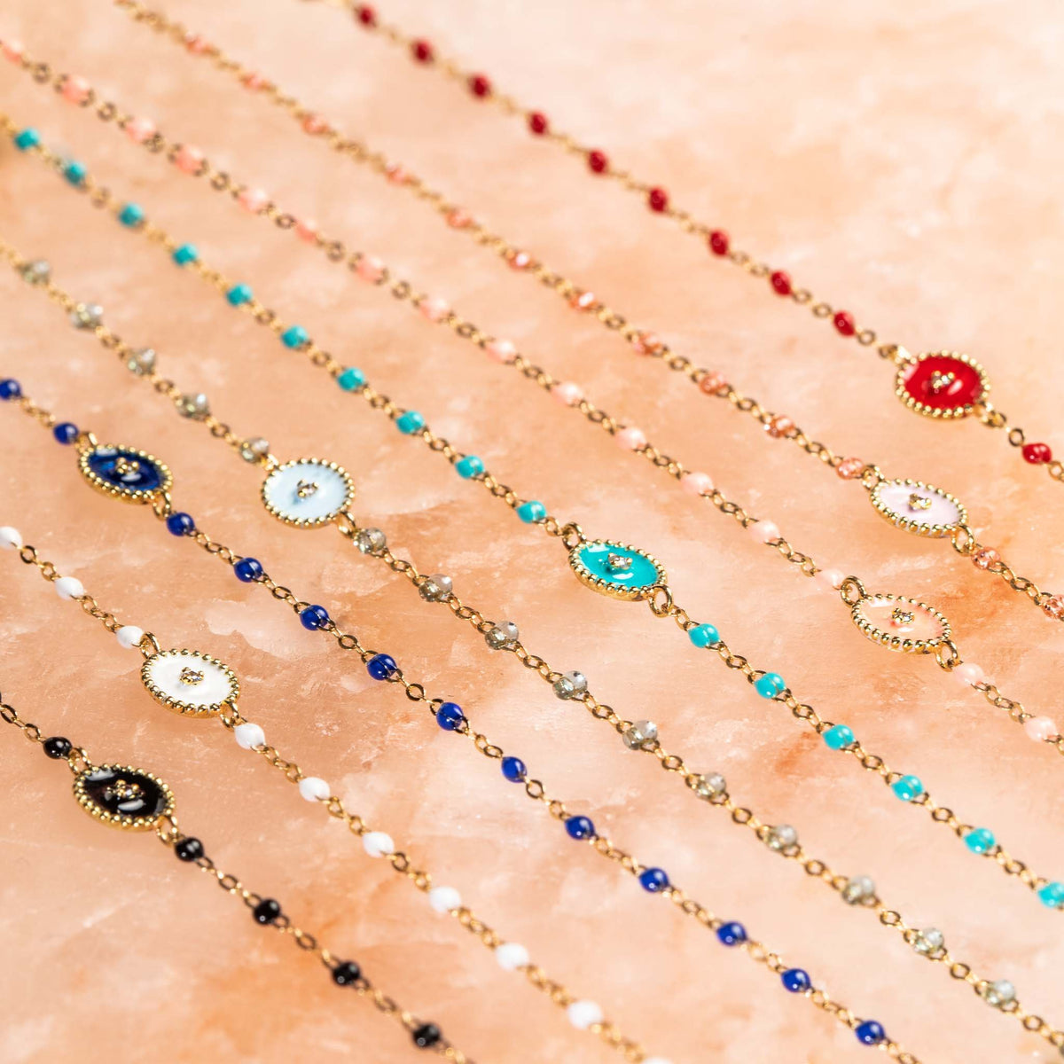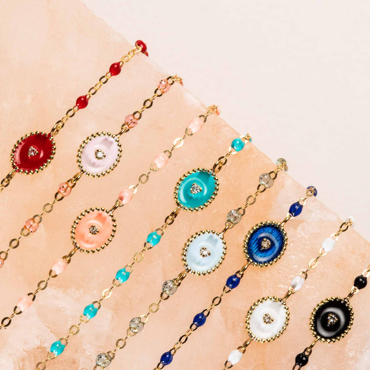 The Classic North Star bracelet by gigi CLOZEAU is a playful yet elegant reminder of our joyous journey through life. This striking piece features 18 carat gold, elegant resin pearls and a timeless design.