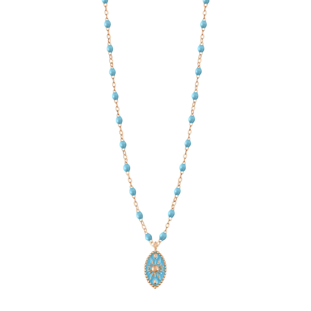 The Gigi Clozeau Karma necklace in 18 carat rose gold on a Classic Gigi chain, with elegant, Turquoise pearls of resin. The perfectly placed, detailed pendant is a precious talisman, offering light and protection.
