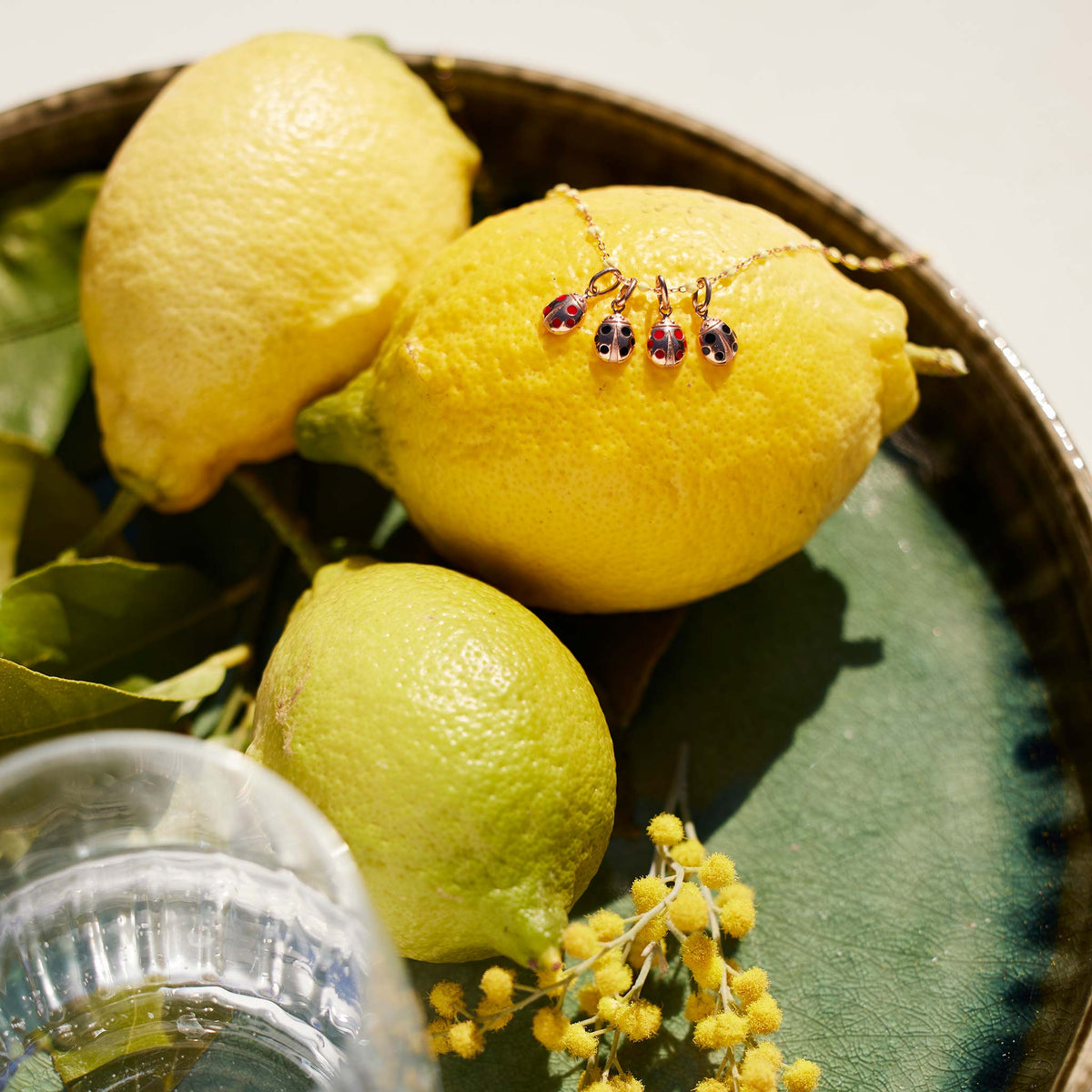 We want to wear it all year long. The gigi Clozeau Black Ladybug pendant, with 18 carat rose gold.
